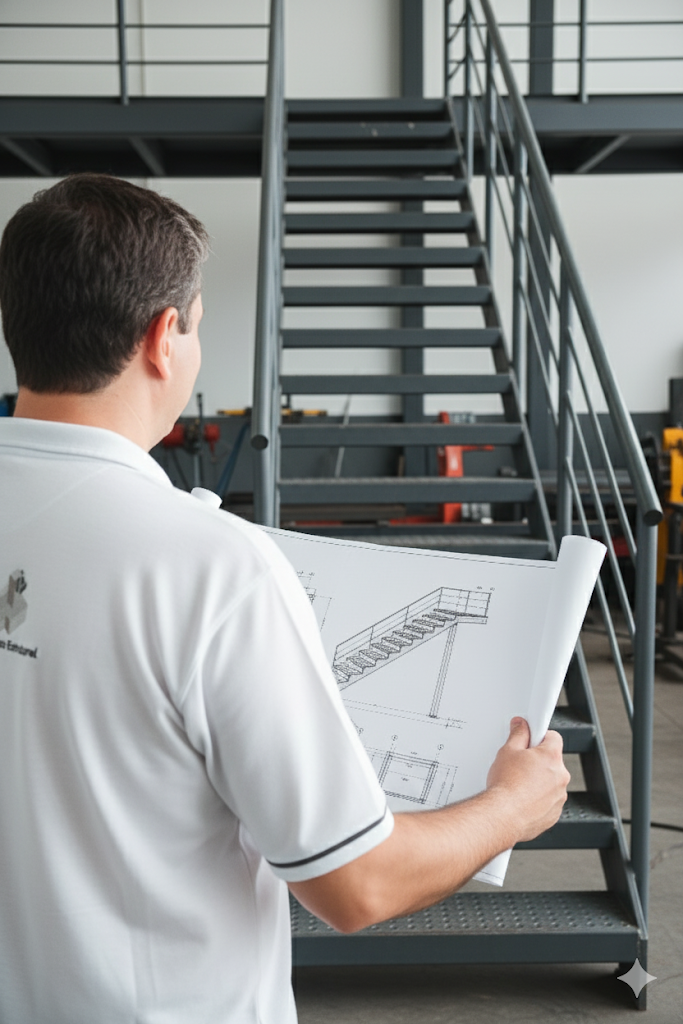 Dimensionamento dos perfis metálicos, degraus e fixações para suportar o peso previsto. - Escolha de materiais e acabamentos