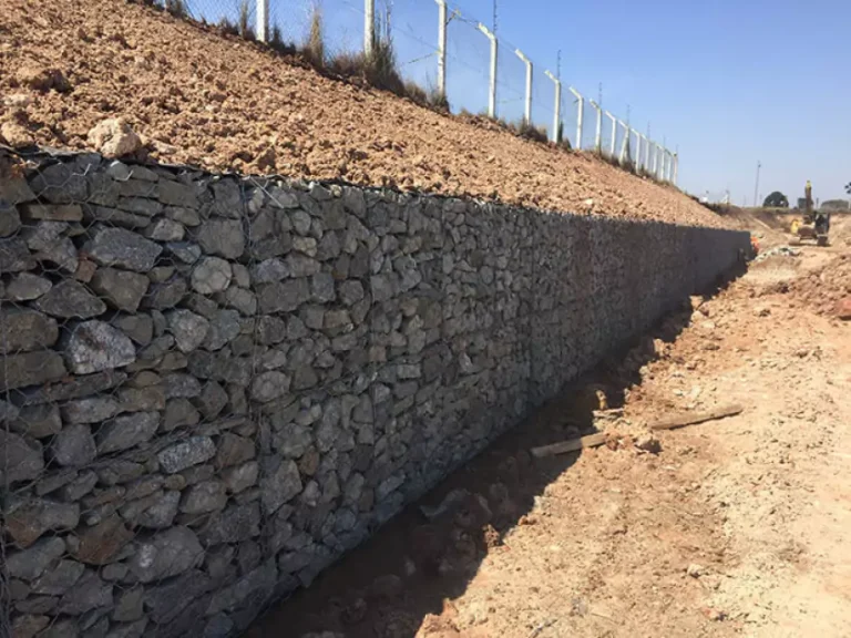 - Gabiões: estrutura de aço preenchida com pedras, mais rápida de montar.