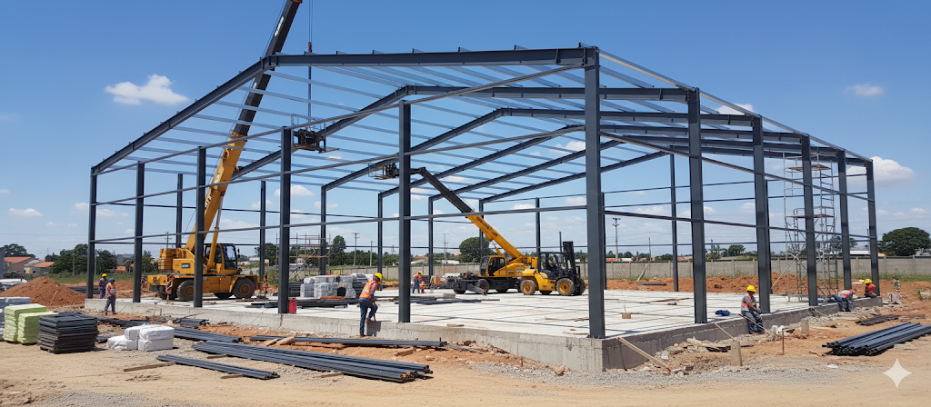 Galpões pré-fabricados combinam rapidez de montagem e custo relativamente baixo. São ideais para quem precisa de agilidade e padronização.