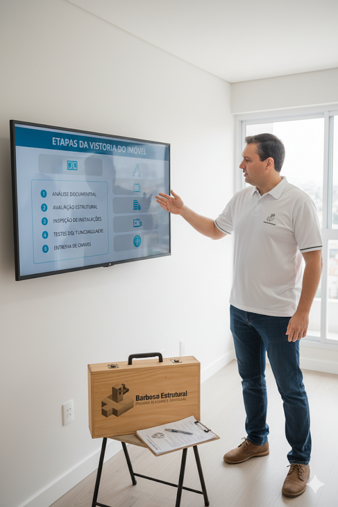 A vistoria é a etapa em que o engenheiro realiza uma inspeção detalhada no imóvel, analisando: