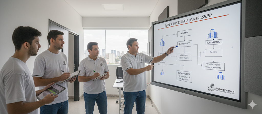 O desempenho estrutural é a base da segurança de qualquer edificação. A norma estabelece limites de deformação, fissuração e resistência, garantindo que: