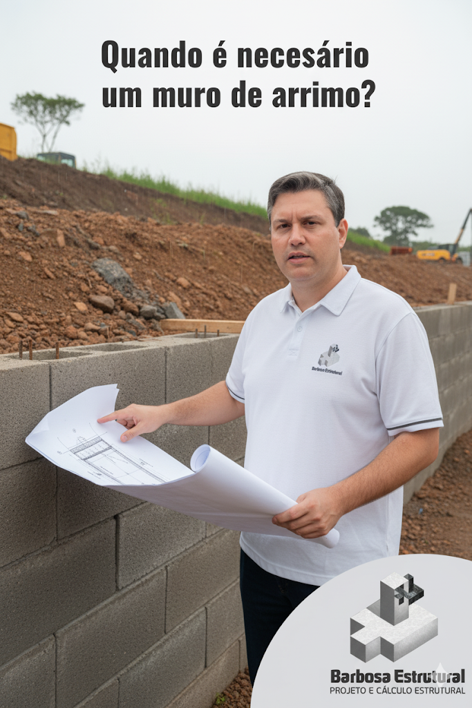 A necessidade de um muro de arrimo deve ser avaliada por profissional habilitado, geralmente um engenheiro civil, que realizará estudo do terreno, análise do solo, dimensionamento do muro e planejamento da drenagem. A execução sem projeto adequado pode gerar riscos como: