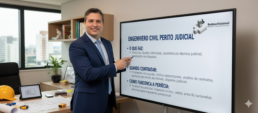 O engenheiro civil perito judicial é o profissional nomeado pelo juiz para esclarecer questões técnicas em um processo. Seu compromisso é com a verdade técnica e a imparcialidade. Ele analisa o caso, realiza vistoria, aplica métodos de engenharia diagnóstica e entrega um laudo pericial que ajuda o magistrado a decidir.