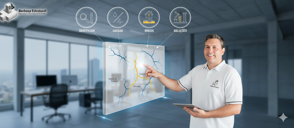 A avaliação técnica correta identifica a causa-raiz e define a solução certa. O profissional pode emitir laudo de engenharia, ART e plano de intervenção.